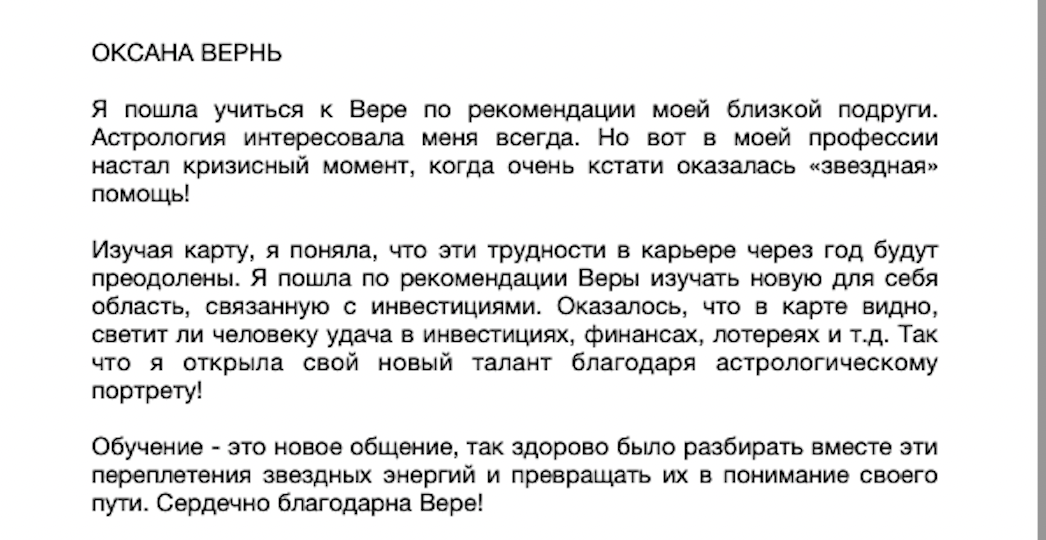 Как опытный преподаватель я умею очень хорошо учить, объяснять самые сложные вещи просто и понятно. Как философ и психоаналитик я вижу и проблемы, и способы их решения. Как практик с многолетним опытом, я знаю как читать звездную карту и убедилась в точности предсказаний. Многие мои ученики сами стали профессиональными астрологами, многие обрели гармонию в своей жизни и поняли, как путешествовать по жизни с помощью волшебной науки астрологии!